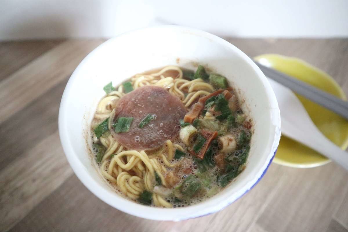 液体スープを加えて完成。 具材は、チャーシュー、玉ねぎ、ねぎ、メンマが入っています。