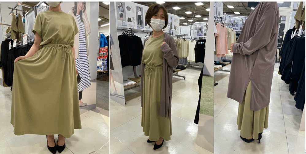 野村さん:トレンドの“マキシ丈”ワンピースに、脱着可能なアウターを組み合わせてみました。一見、色合わせが難しそうな「くすみカラー同士」を、あえて重ねて着るとおしゃれです。室内外の温度差が大きい季節に体温調整ができる、人気のコーディネートです。