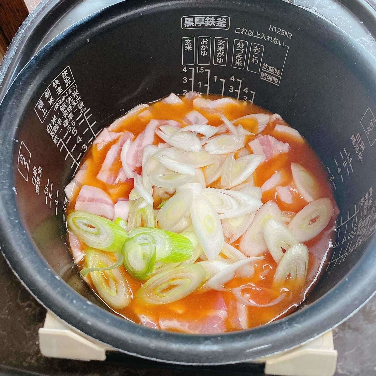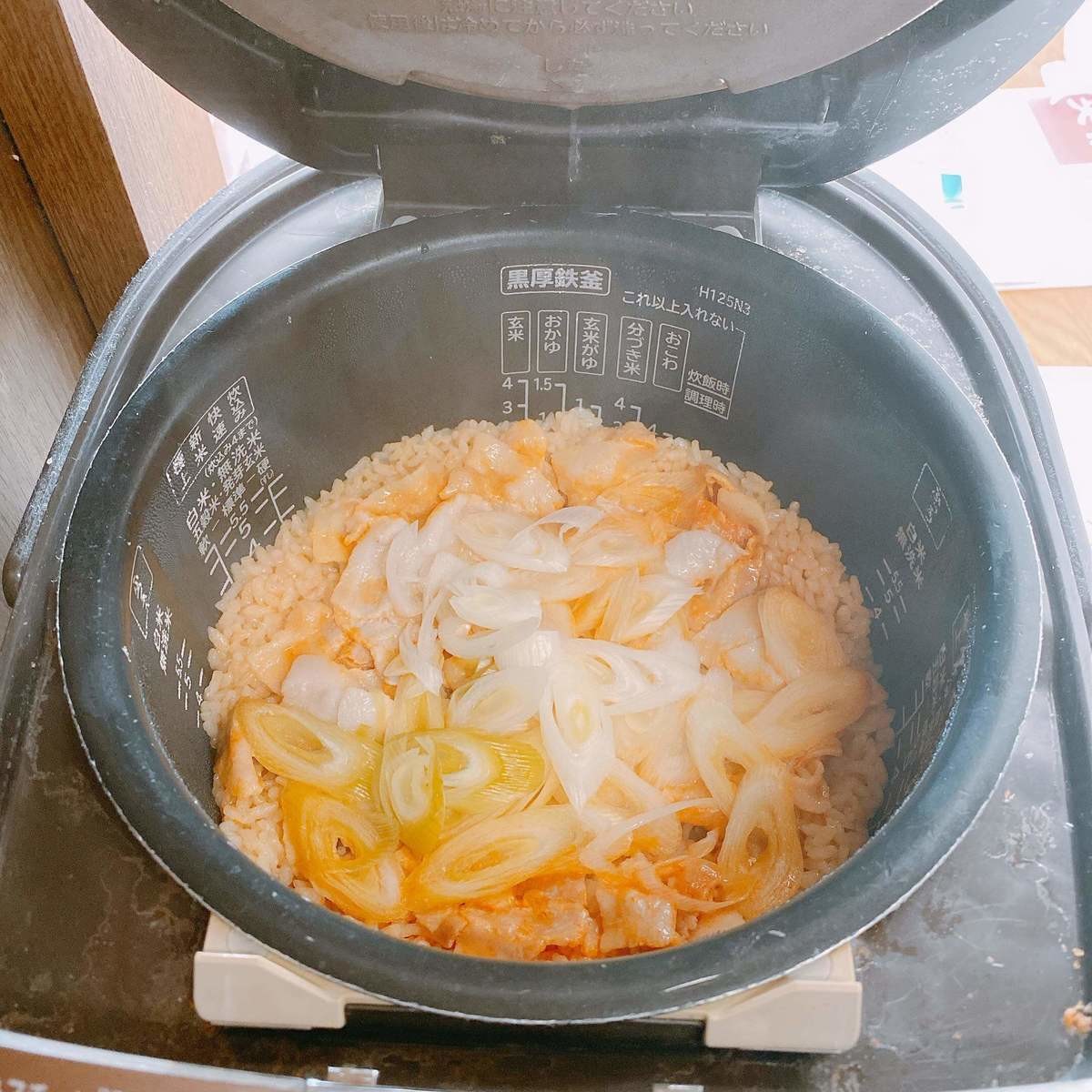 - 1に豚肉をほぐして乗せ、その上に斜め切りにした長ネギを乗せて、炊き込みモードで炊きます。