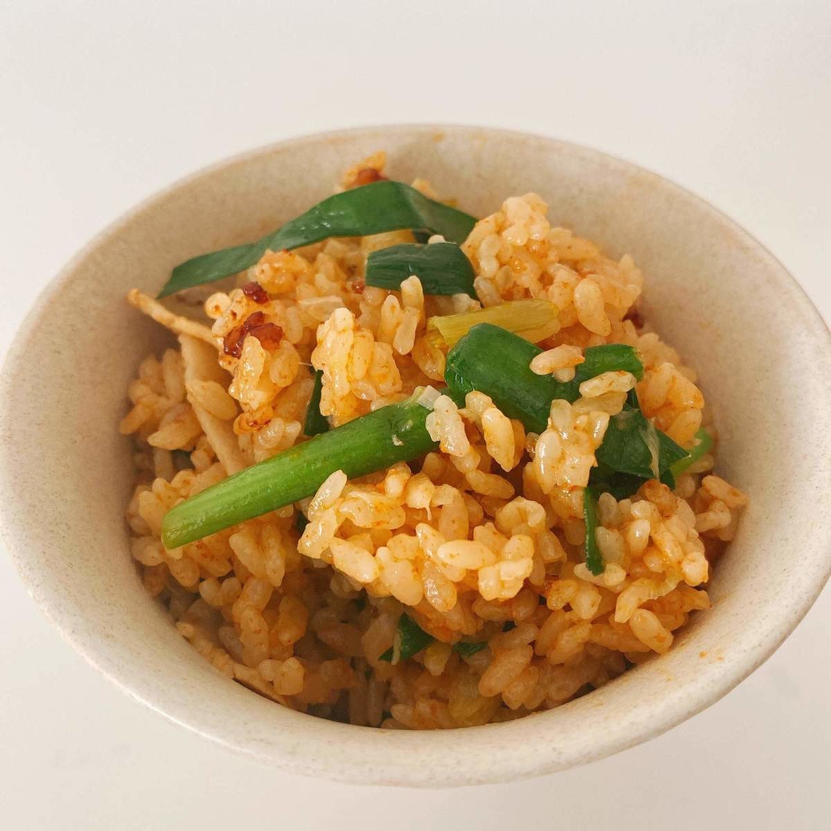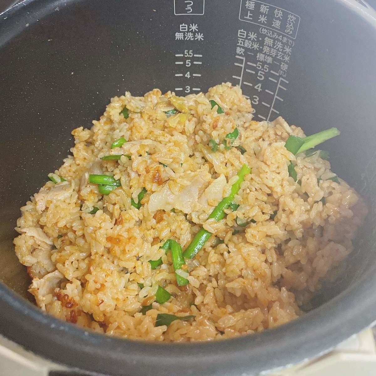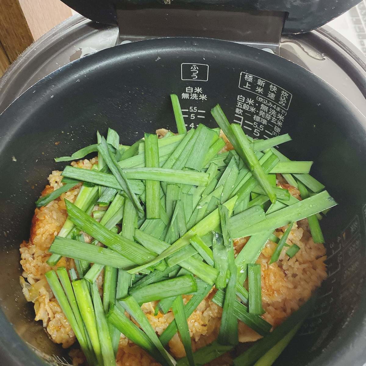 - 炊き上がったら、5cm幅に切ったニラを入れて全体を混ぜます。