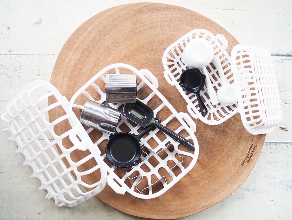 クッキー型やミニ計量スプーンなど小さくて軽いキッチン小物をカゴにイン!