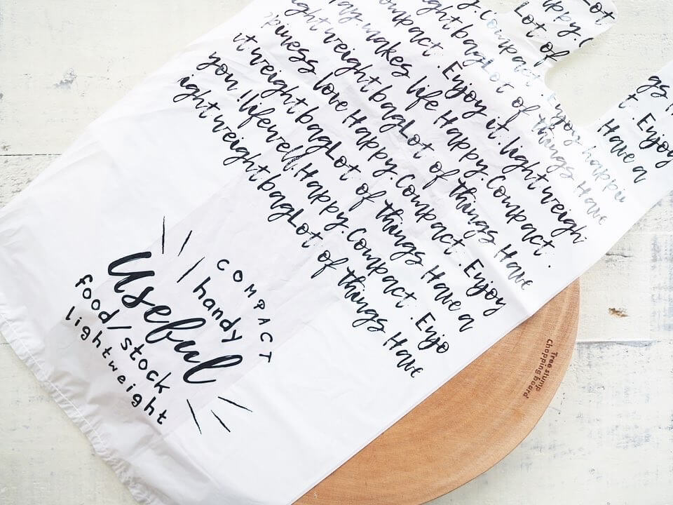 シンプルなホワイトのレジ袋ですが、全面にモノトーン英字柄がプリントされているのでスタイリッシュな印象ですよね♪