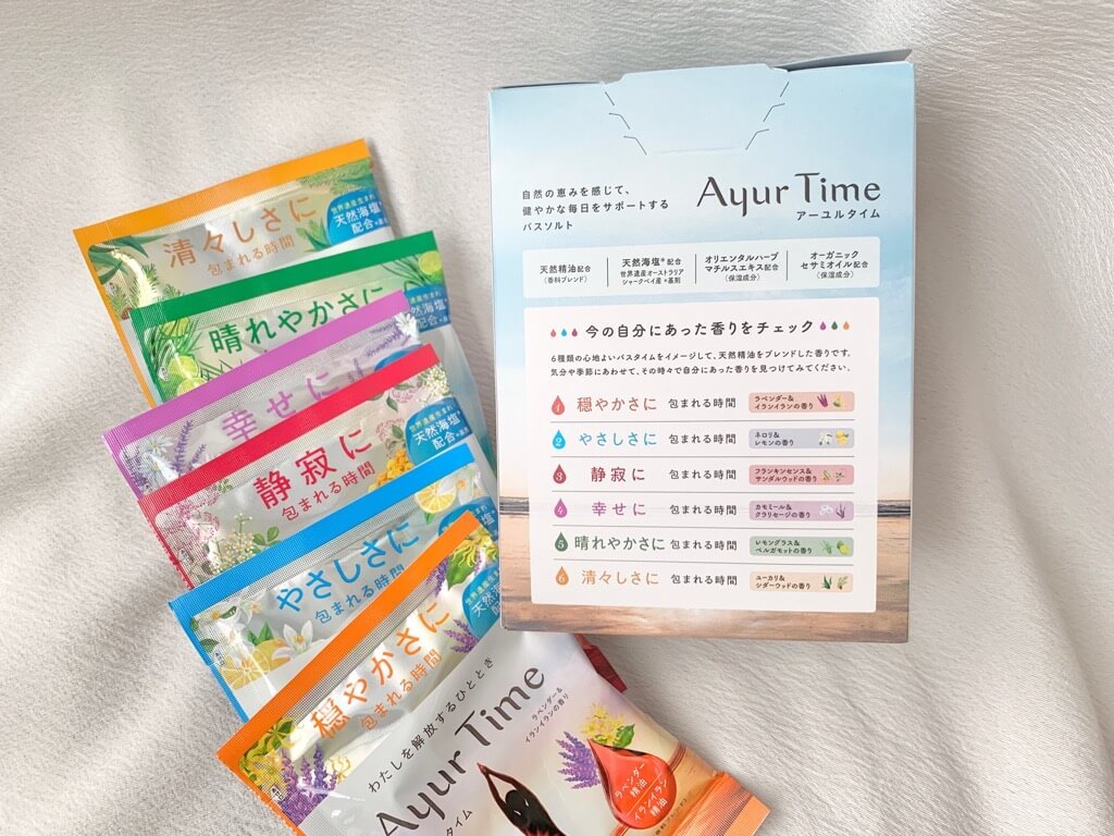 バスクリンから出ている「アユールタイム」のバスソルトは心地よいと感じる天然精油をブレンド。 6種類の香りがそれぞれ楽しめる「アユールタイム シックスタイムズコレクション」。