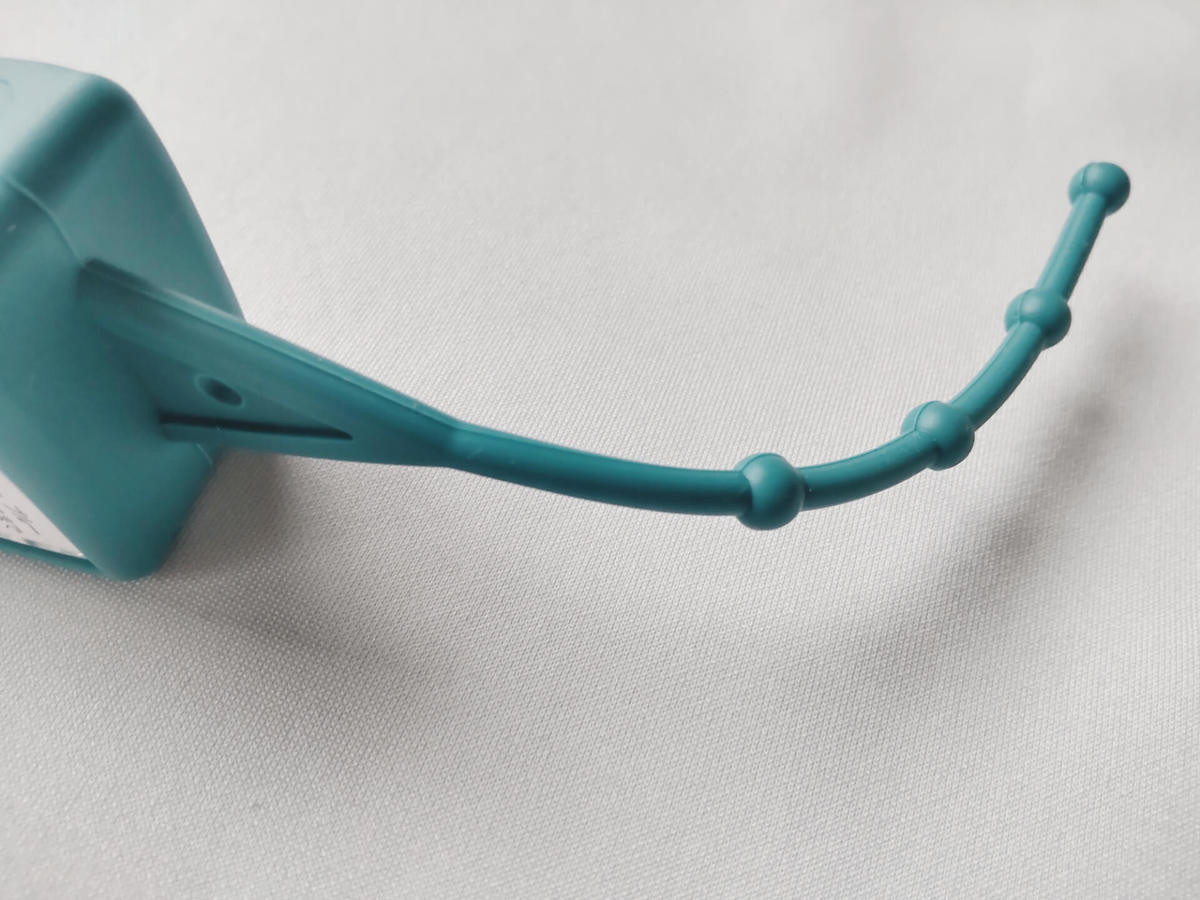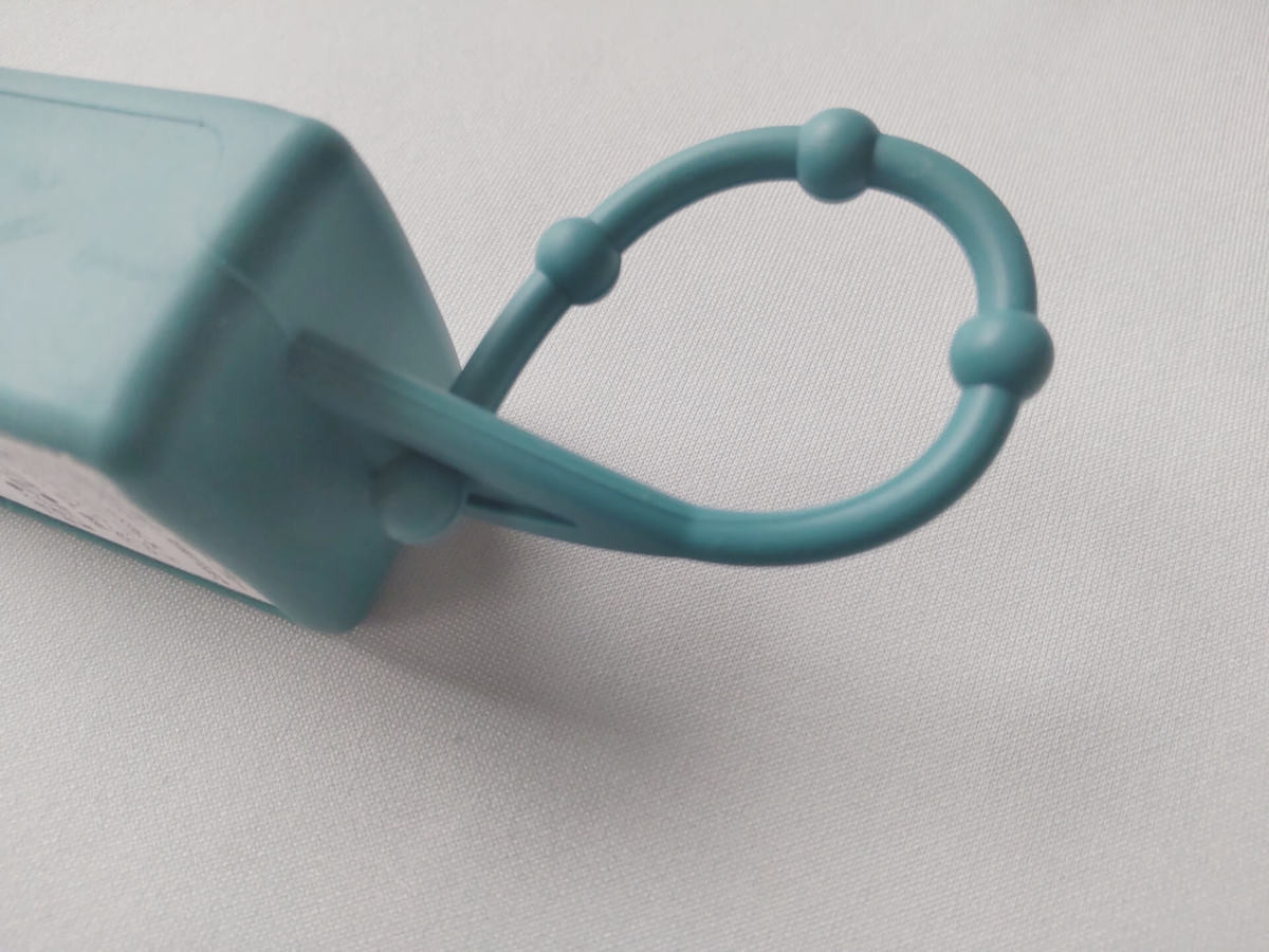 ユニークなのが、携帯しやすいようにシリコーン素材のカバーがついていること。先端についた「輪っか」を外すと、バッグなどに取り付けが可能です。