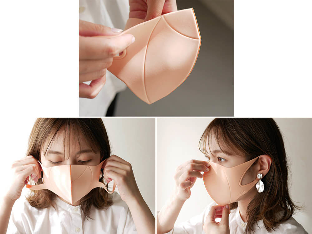 人間工学に基づいた全方位フィット構造でフェイスラインにフィット。ズレや顔とマスクの隙間を軽減し、さらに立体構造により口元にスペースを作り、息苦しさも配慮された構造。