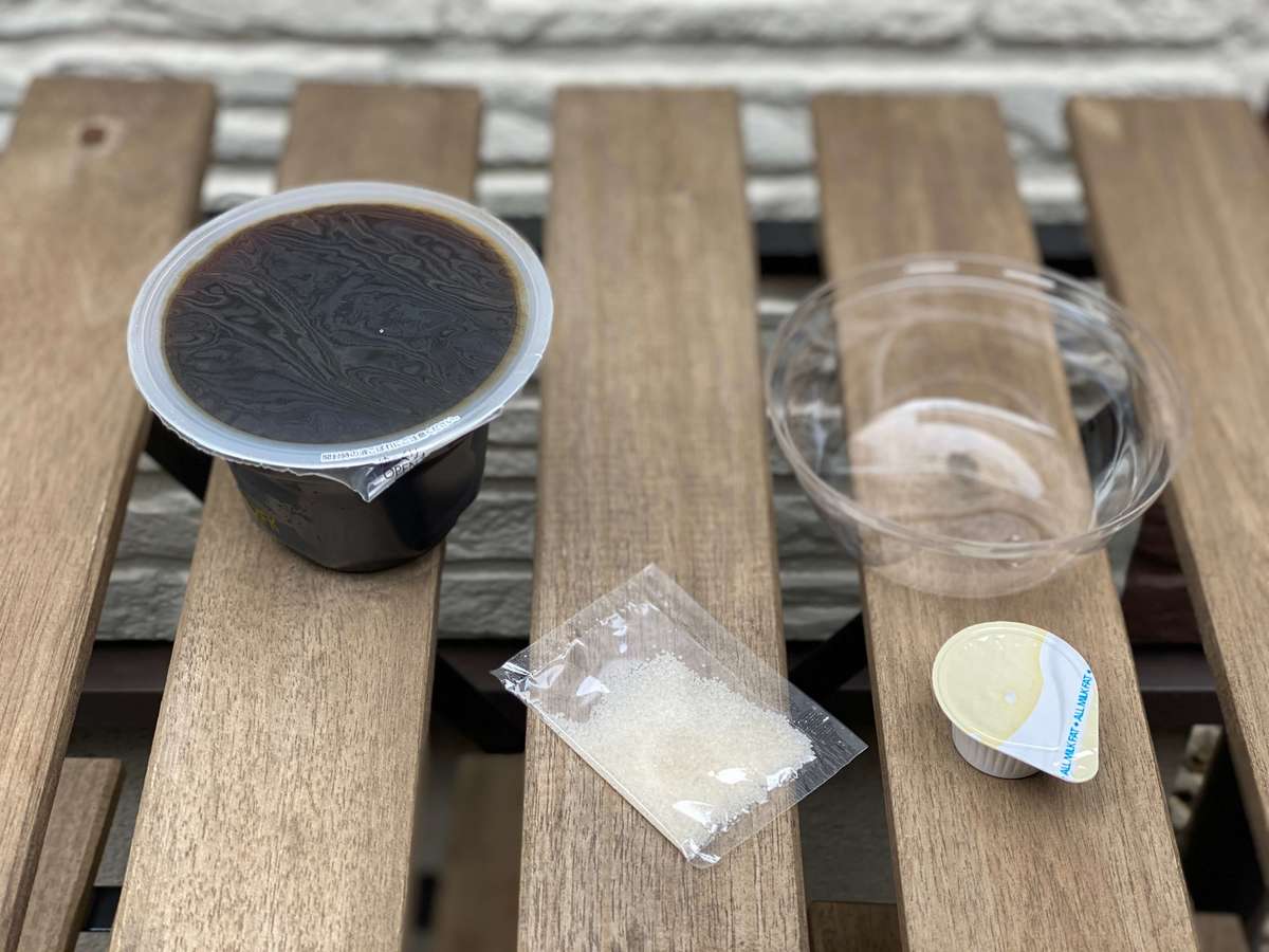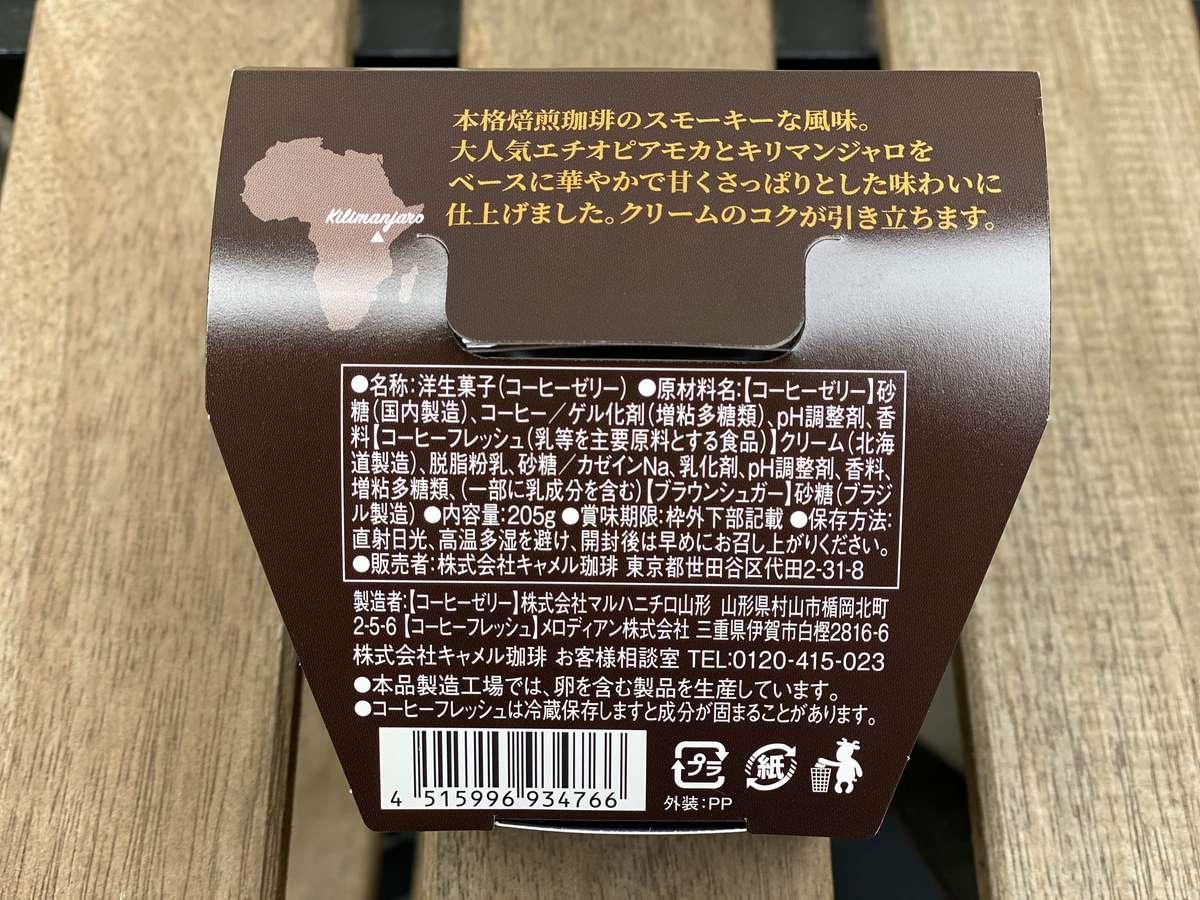 内容量は205gと、コーヒーゼリーにしてはたっぷり入っています。トッピング用にコーヒーシュガーとコーヒーフレッシュがついています。