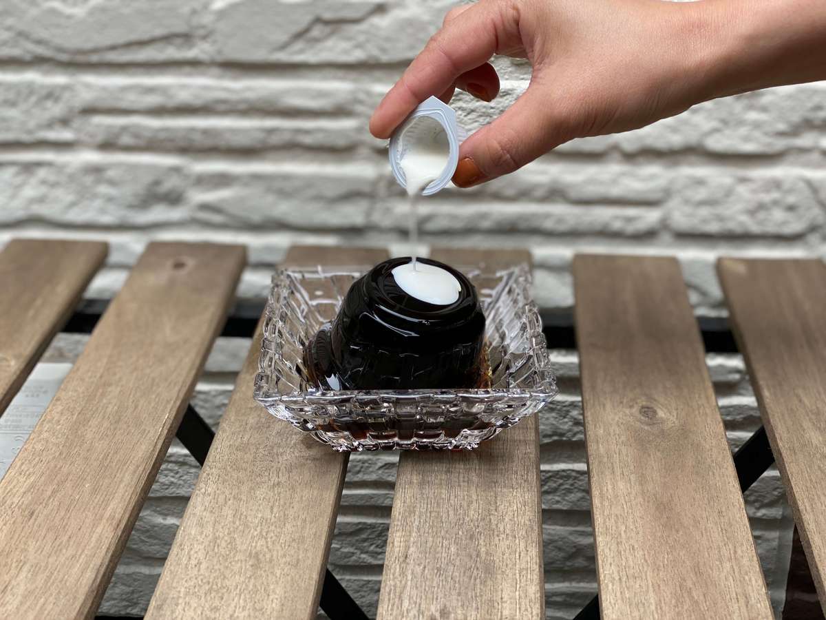 このくぼみを目掛けて、コーヒーフレッシュとコーヒーシュガーをかけてください。