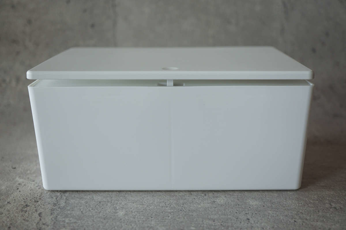 蓋の手前の真ん中部分を軽く押すとふたが開き、片手でも開けれる仕組みになっています。