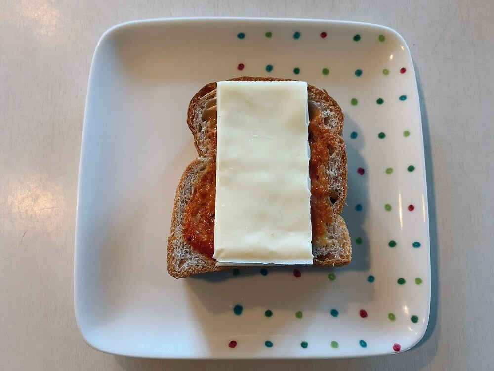 ②で味噌と牛乳を塗った食パンに、ピザソースを塗り、①のマヨネーズを挟んだチーズをのせます。
