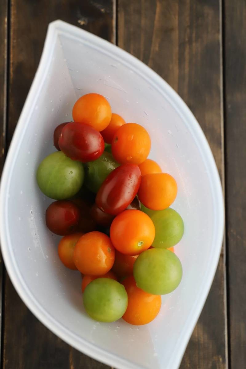 大きなサイズの方を洗い、プチトマトを入れてみました。