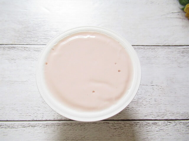 フィルムを剥がしたら、いちごの香りがするきれいなピンク色のレアチーズケーキです。