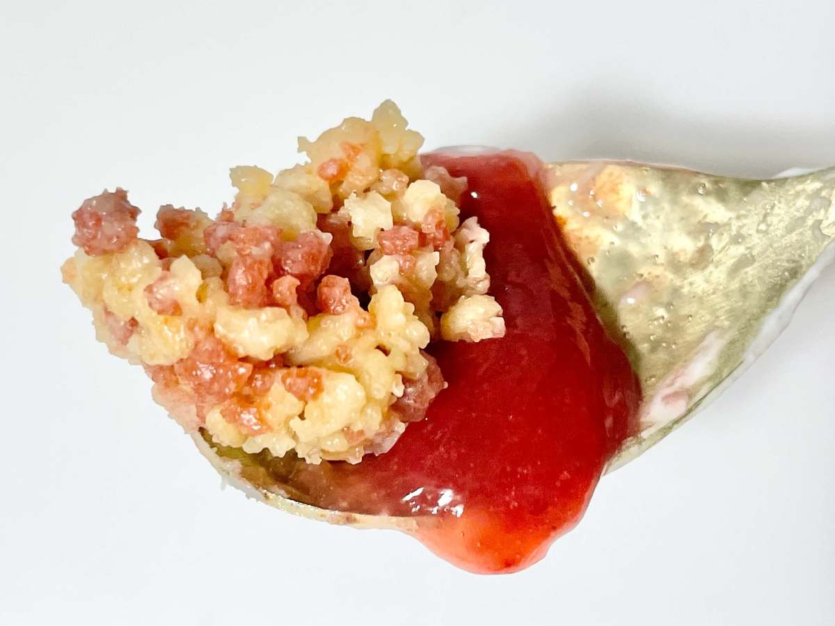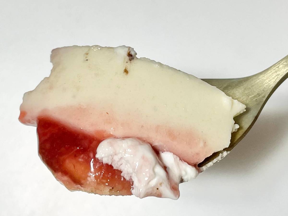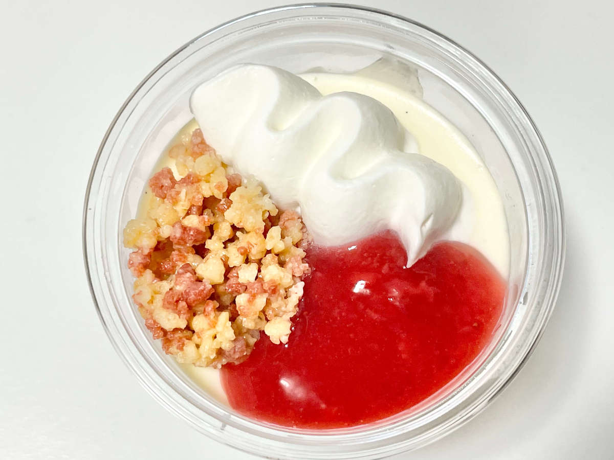 ビスケットは苺味で、細かく刻まれていて柔らかい食感です。