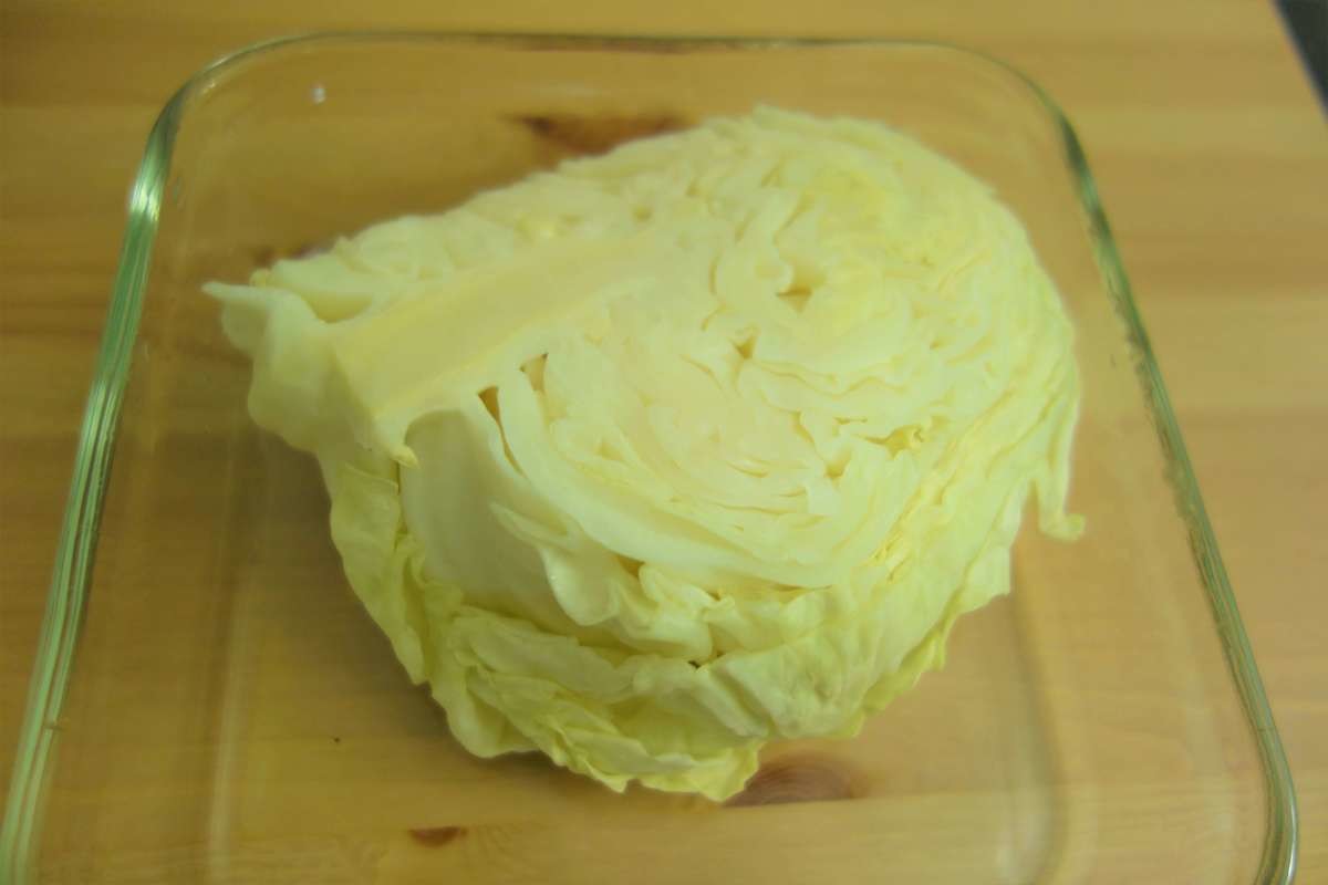 カットしたキャベツを水で洗い、水を切らずに耐熱容器に入れます。ふんわりラップをしたら電子レンジ500Wで5分温めます。