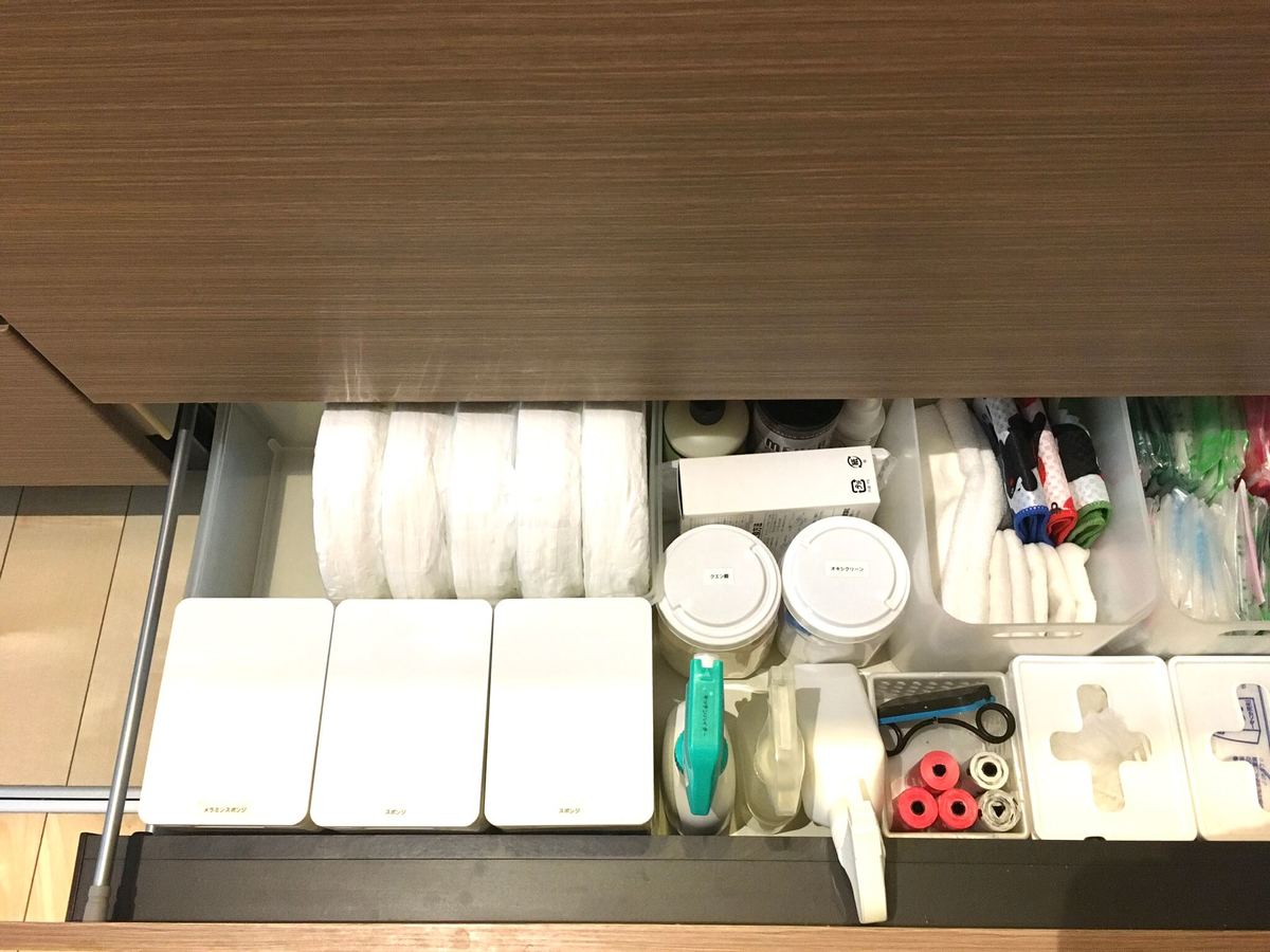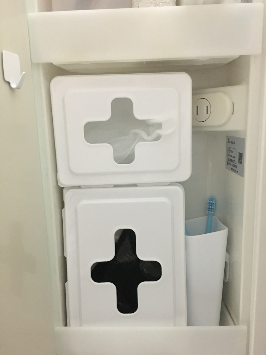 それぞれ使う場所に保管しておくのが使いやすいので、キッチン・洗面所に置いています。保管はセリアの「プルアウトボックス」が1枚ずつスッと取れるので使いやすくて愛用しています。