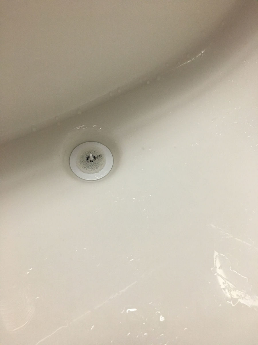 洗面台の排水口には入居時ポップアップ式がついていましたが、掃除のしやすさを考えゴミ受けをセリアの目隠しゴミガードに変更。