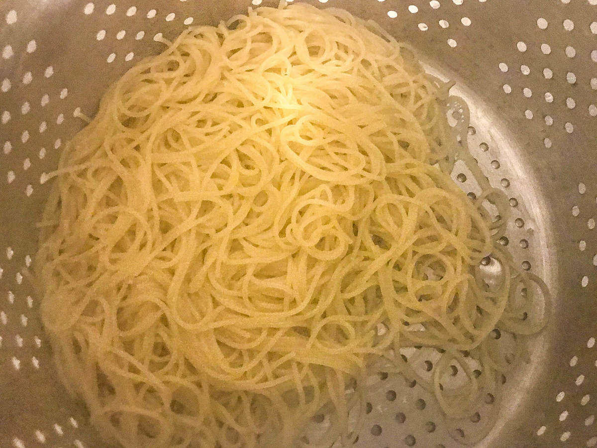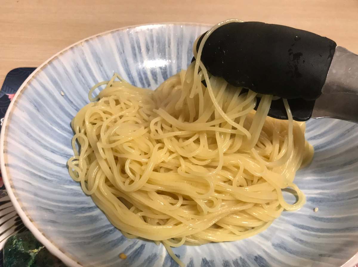 どちらも見た目は普段のパスタより黄色みがかっていて、中華麵に一歩近づいた気がします。トングで持つと、通常の茹で方をしたパスタよりも、少し柔らかさが増す印象です。