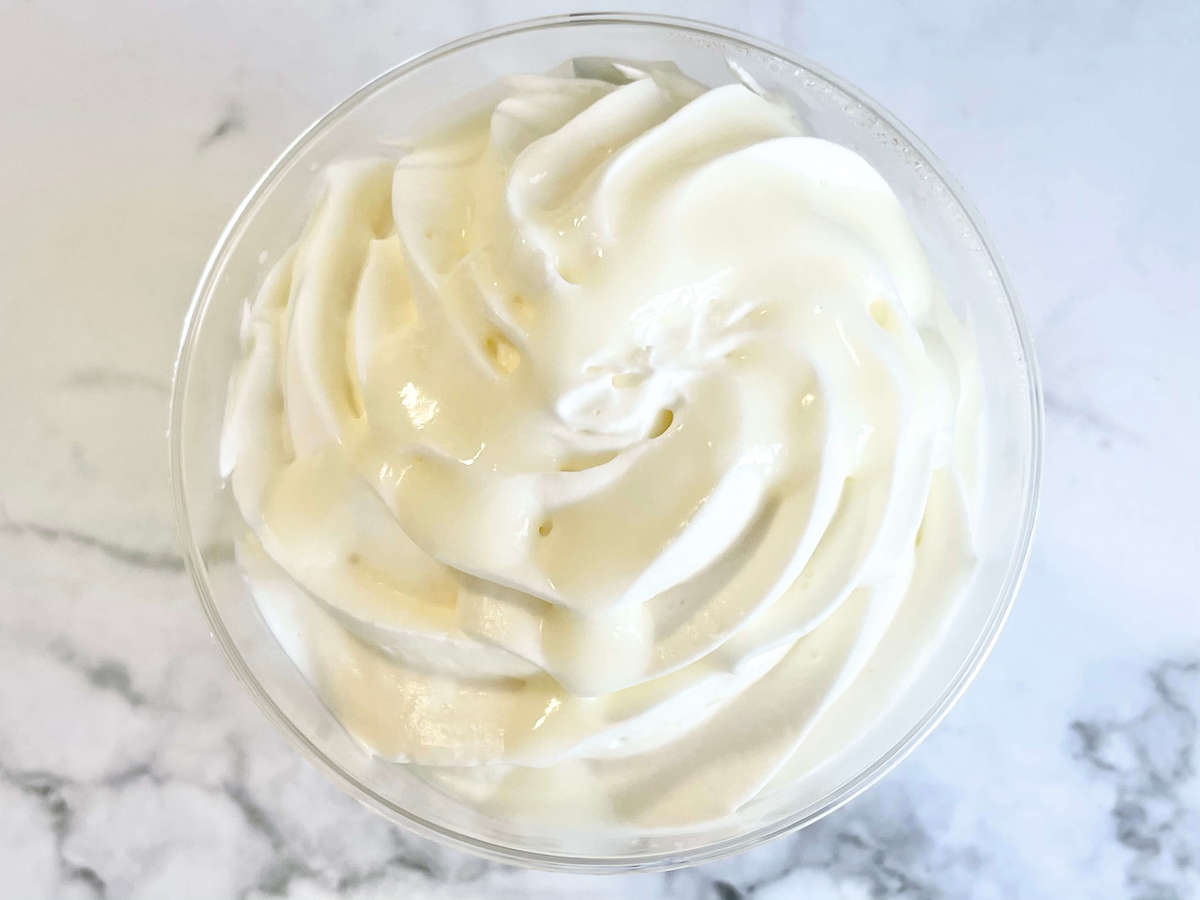 ホイップも練乳ソースも、どちらも白く一見見分けがつかないですが、よく見ると間に練乳ソースが入っています。