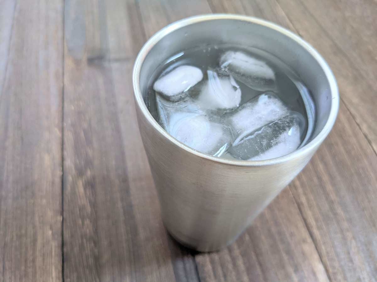 ステンレスタンブラーにたくさんの氷と水を入れ、しばらく置いておきました。 普通のグラスだったらすぐ結露ができますが、いつまで経ってもテーブルの上はサラサラのまま。