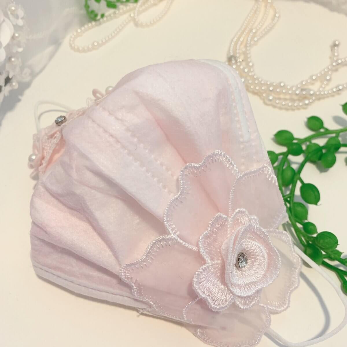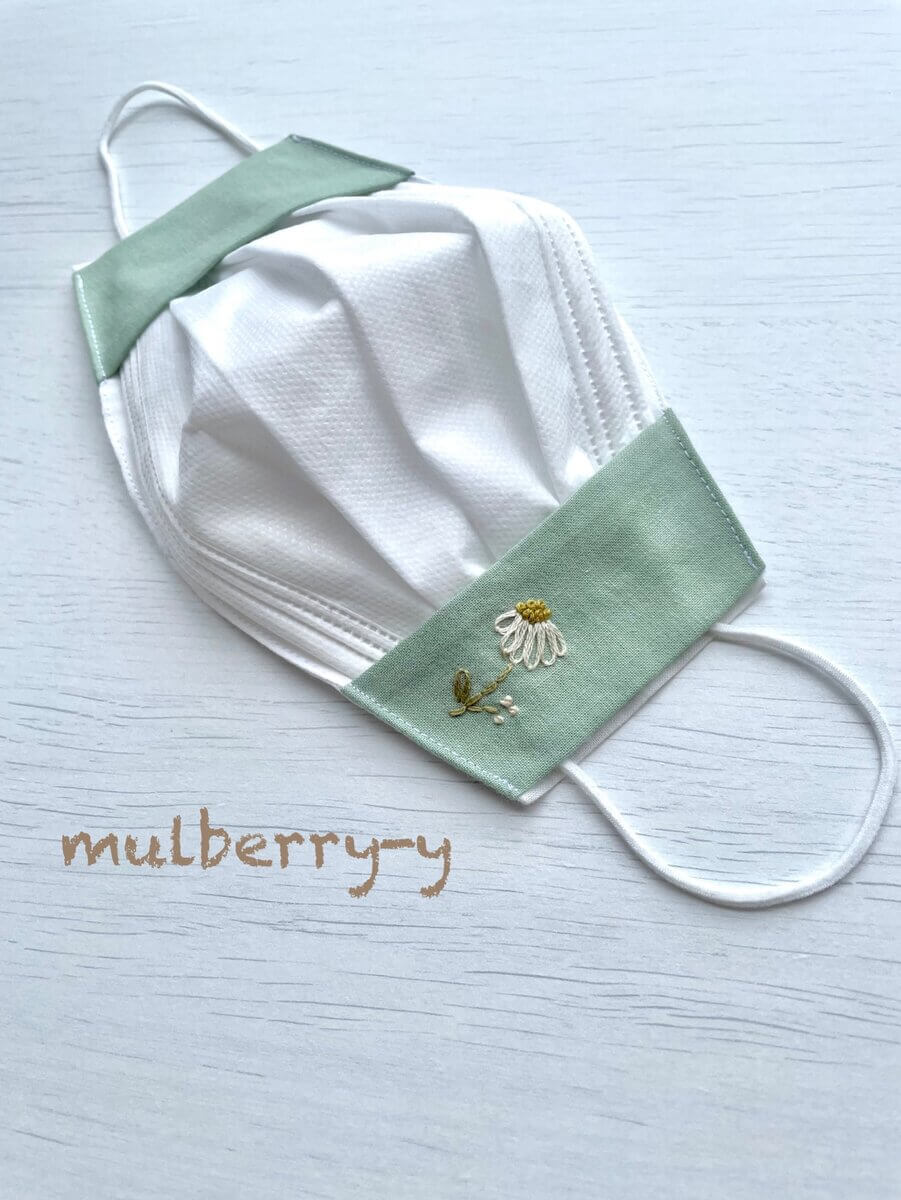 最初にご紹介するのは、デイジーのお花を手刺繍されたカバーマスクです。両脇のベルト部分に不織布マスクを通すだけで重ね付けすることが可能。