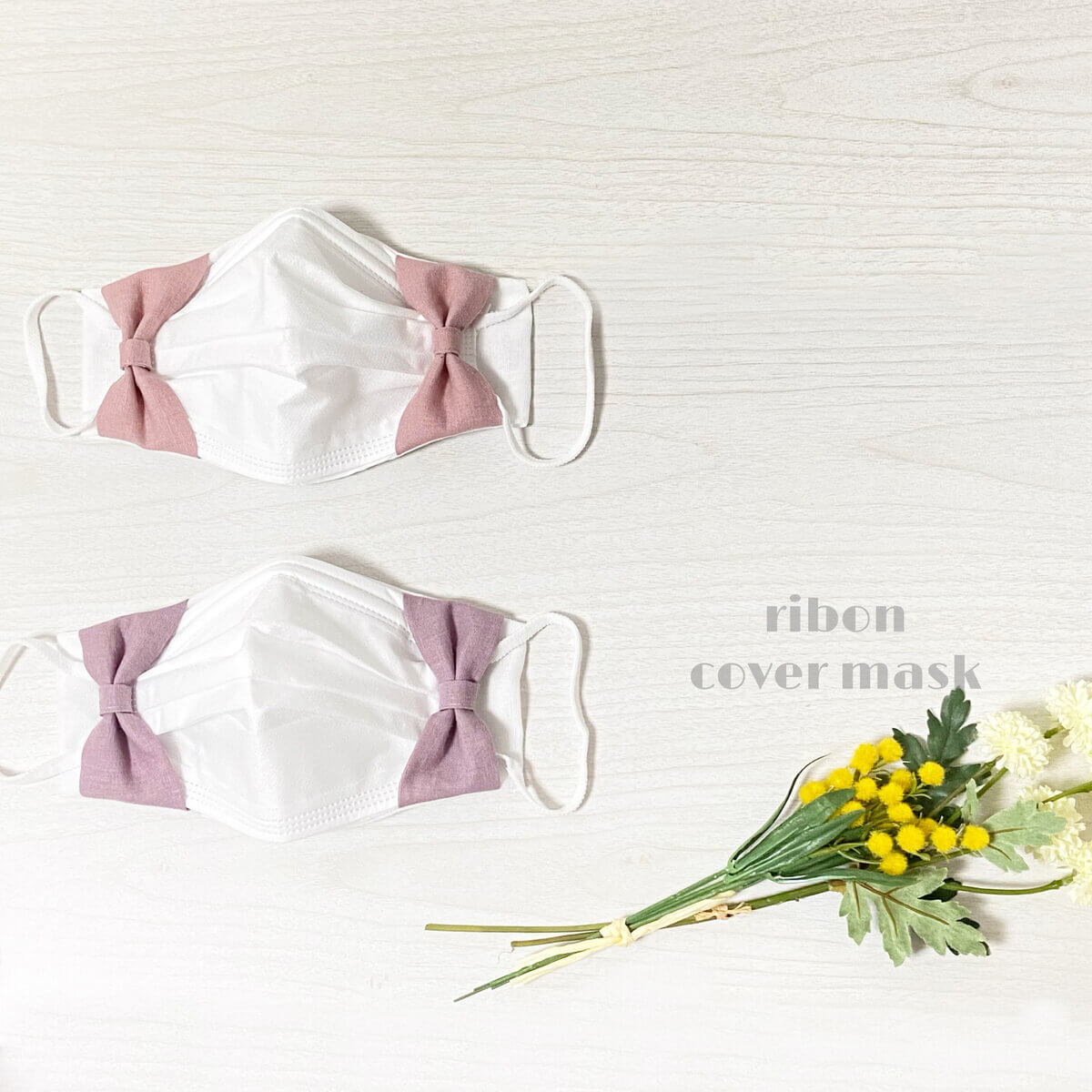 両サイドのベルト部分にリボンデザインを施し、ナチュラルに可愛さを持ってこられるカバーマスク。