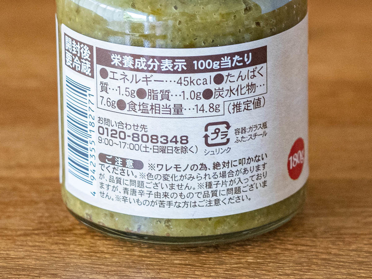 柚子こしょうの鮮やかなグリーンが瓶の外側からもよく見え、色合いもとてもきれいです。