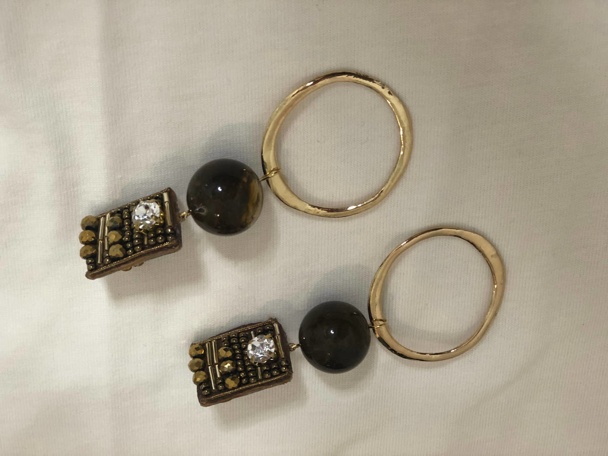 着飾りにくい公園コーデは、大ぶりのアクセを1点投入するのが正解!長さ5cm以上の大ぶりピアスを選べば、顔周りが華やかになり、小顔効果も狙えます。大人は茶色などのシックな色みを選ぶと◎。