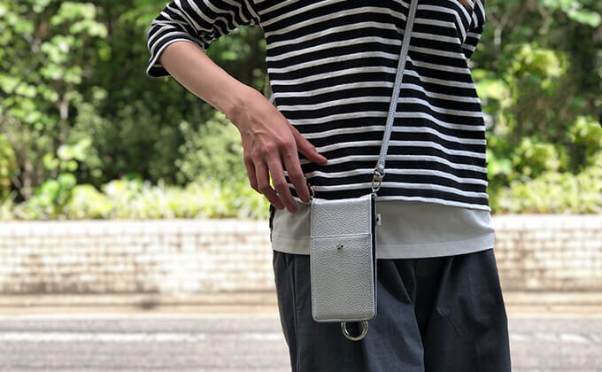 キャッシュレス派に重宝するアクセといえば、スマホケース。カギやICカードを収納できるので、荷物がミニマムに収まり、ワンマイルの外出がラク。ベージュトーンやモノトーンのコーデに合わせやすく、アクセントにもなるシルバーをチョイスします。