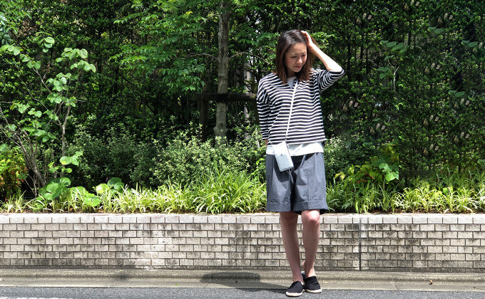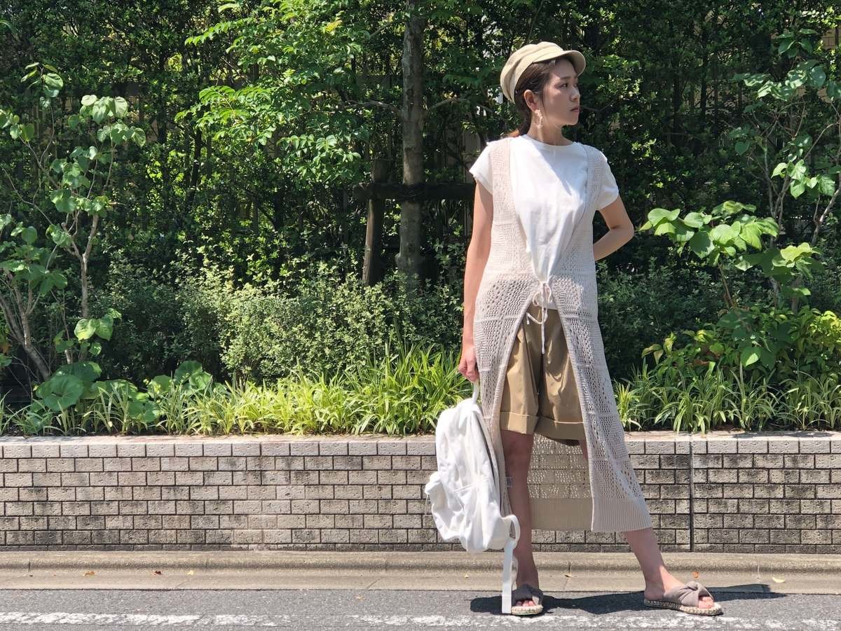 横に広がりにくいシルエットのTシャツと、細見えするショートパンツなら、白の羽織りをレイヤードしても、着ぶくれや膨張見えする心配なし。むしろ、おなか周りや下半身をすっきりカバーし、華奢見せしてくれます。