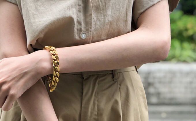 大人が着こなすサファリスタイルは、ゴールドの大ぶりブレスレットで迫力と上品さをプラスするのが鉄則。最旬のチェーンタイプも、ゴールドなら30代・40代が欲しい華やかな雰囲気を自然に演出できます。