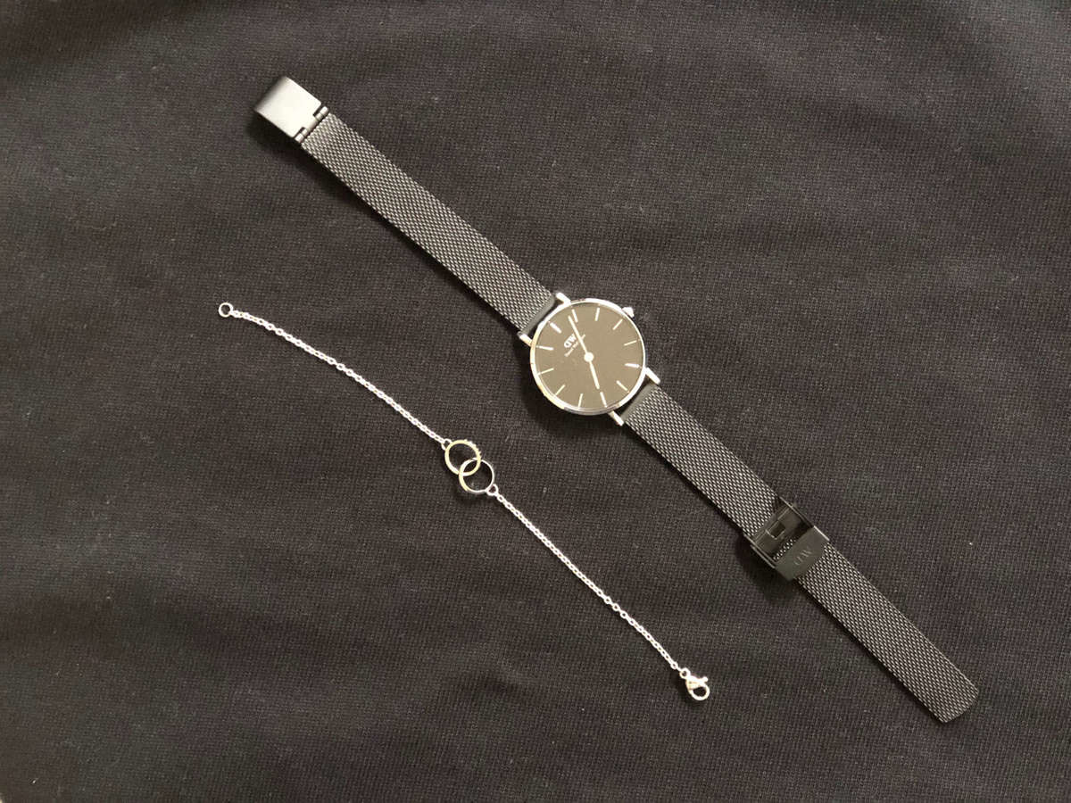 コーデをシックにまとめたら、アクセはあえてシルバーに。上品になりすぎず、夏らしいヌケのある印象が生まれます。時計もアクセとレイヤードして、鮮度を更新するのが気分♪