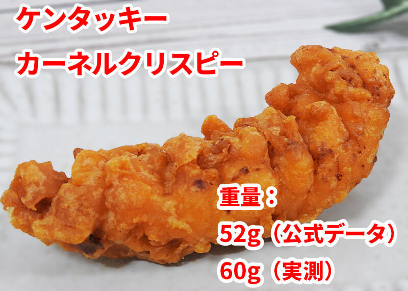 横幅が広いぶんでしょうか、実測した結果ではクリスピーチキンの方が重量が重いことが判明。クリスピーチキンは公式で重量データが見当たらないのでわかりませんが、ケンタッキー「カーネルクリスピー」の重量は「可食部52g」と公表されています。
