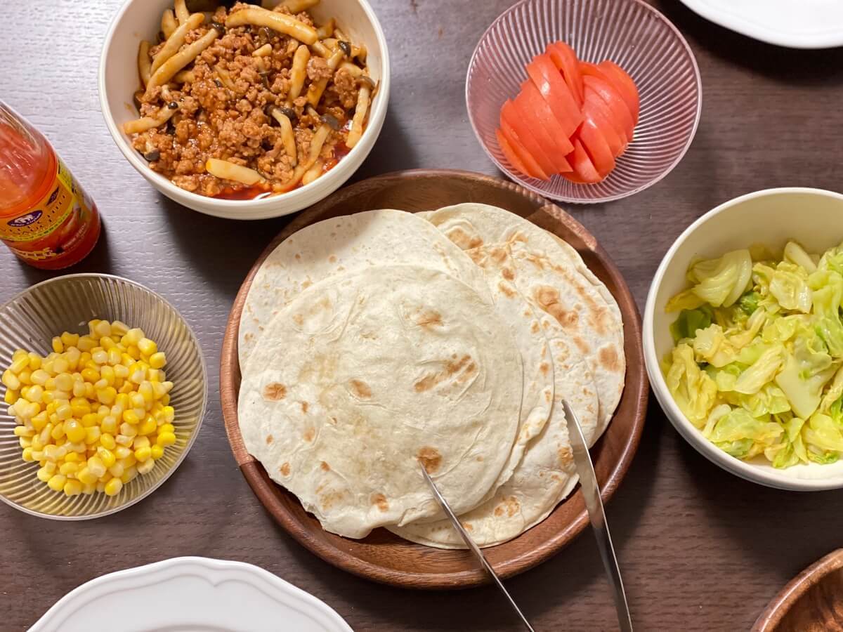 トルティーヤに入れる具材は、トマトやコーン缶、レンジで加熱したキャベツなど、冷蔵庫にあるもので問題ありません。
