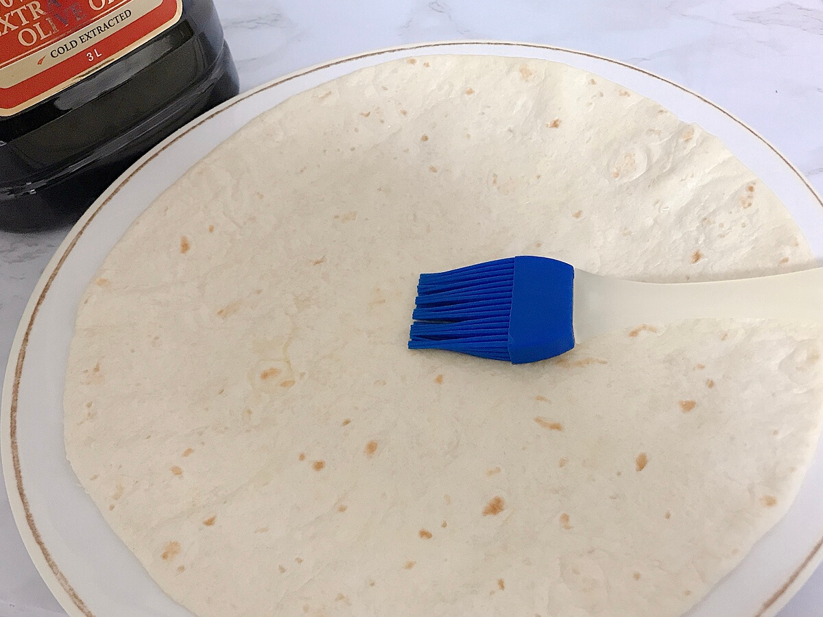 予めトルティーヤ生地に薄くオリーブオイルを塗っておけば、サクサクで食感も楽しいピザに変化します。