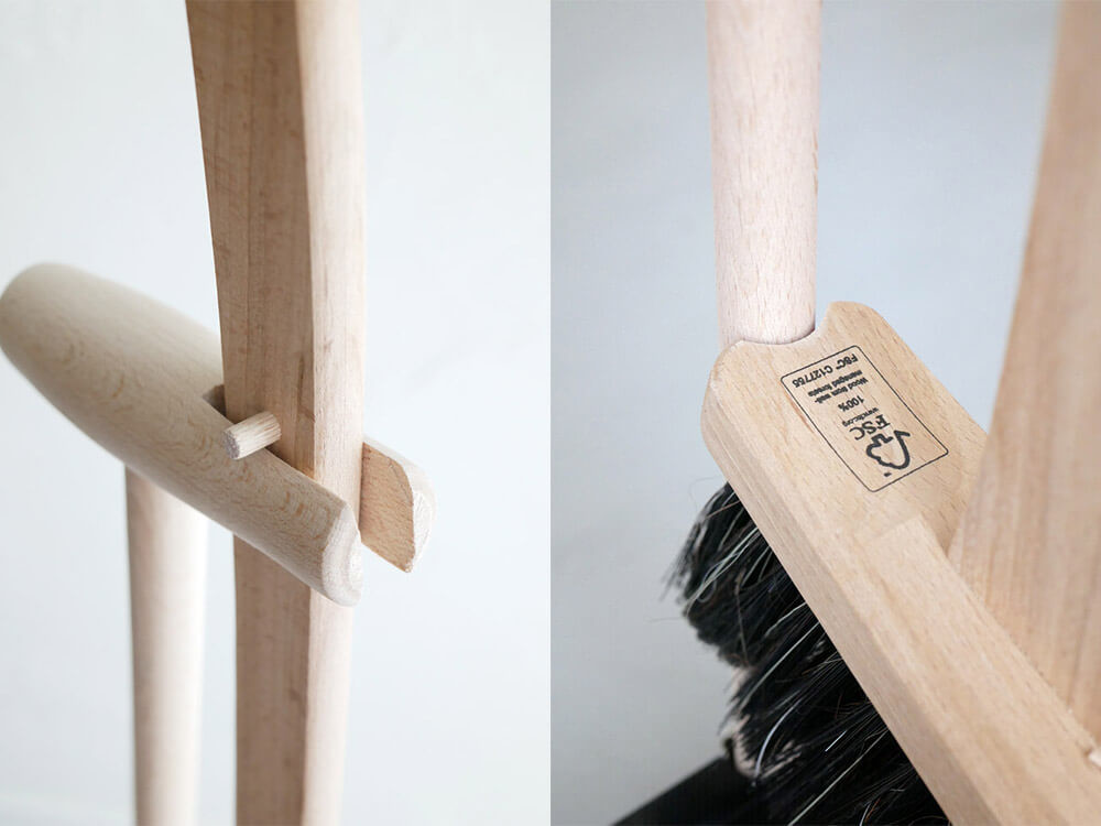 柄の部分は手触りの優しいナチュラルなビーチウッドを使用しています。 チリトリの上下2ヶ所にホウキを引っ掛ける部分があるので、収納時に倒れずにストレスフリーですね。