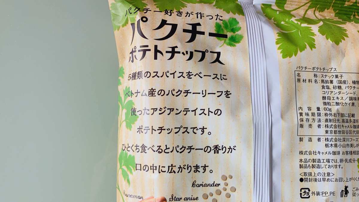 私はパクチーが大好きなのですが、ポテチとなると味があまり想像できません…裏を見てみると“パクチー好きが作った”とあり、期待大。