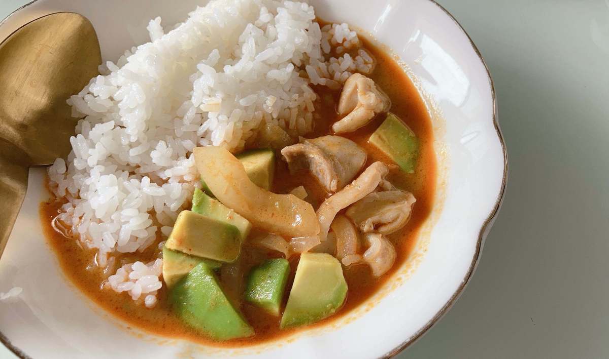 次はマサマンカレースープ、こちらも159円(税込)。こちらもルーのみなので今回は鶏胸肉と玉ねぎ、そして最後にアボカドを入れてみました。本品の説明欄にはお勧め具材として、じゃがいも・玉ねぎ・ピーナッツ・カシューナッツが書かれていました。カレーにナッツ、タイっぽいですよね〜。