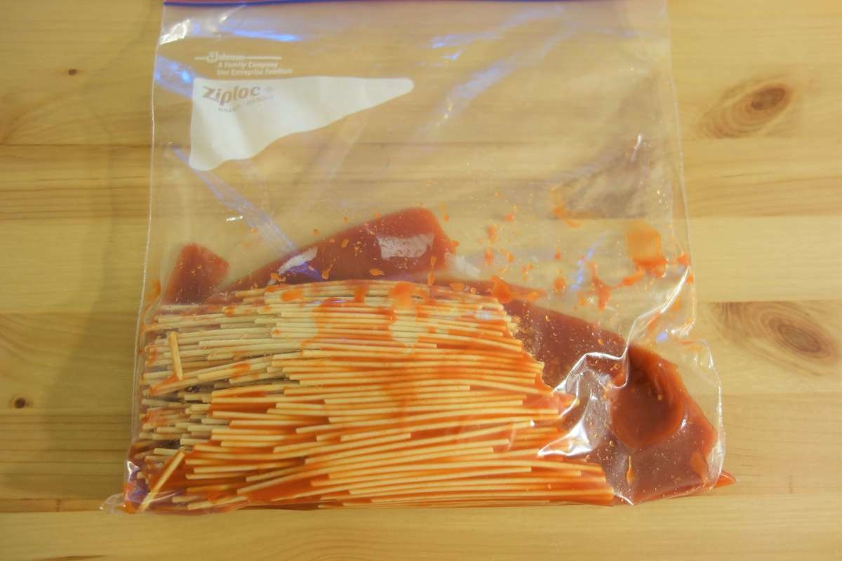 半分に折った乾麺のパスタ200gとトマトジュース300mlを密閉式保存袋に入れ、冷蔵庫に入れて3時間浸します。