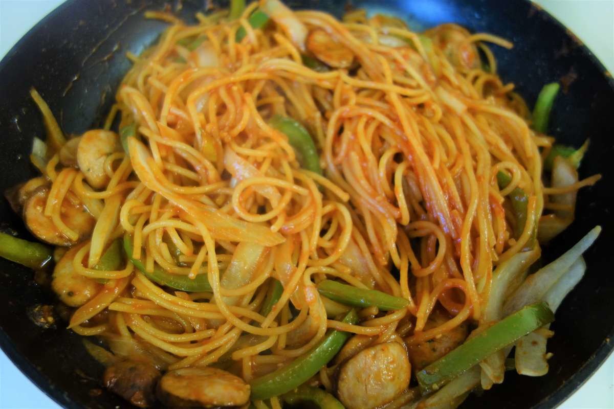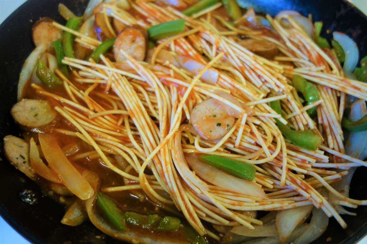 7分後フタを開けてびっくり。パスタがソースをしっかりと吸って見た目はまさにナポリタンです。