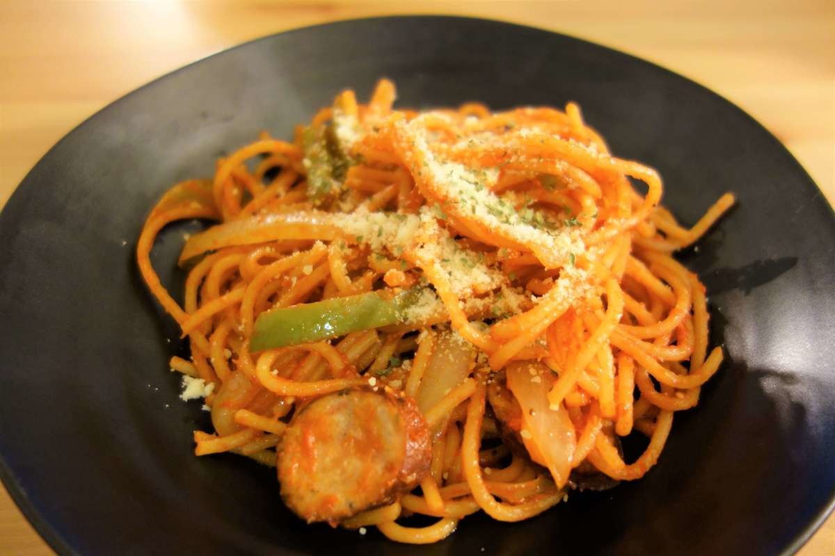 お皿にナポリタンを盛り付けて、粉チーズをかけて完成!