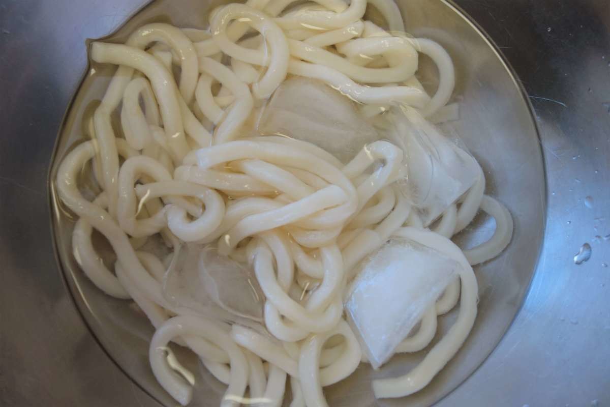 氷水でしっかりしめることで、冷凍うどんでもコシがでて美味しくいただけます。