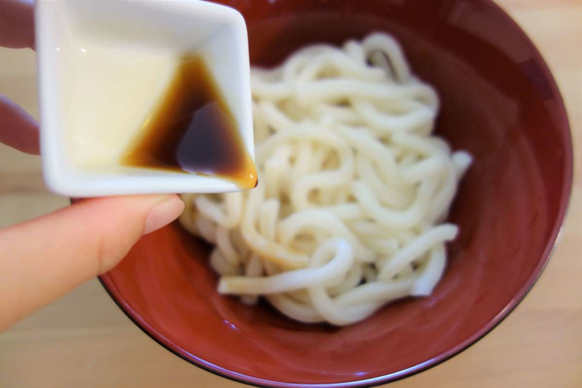 めんつゆとコーヒーフレッシュをうどんにかけて、混ぜます。