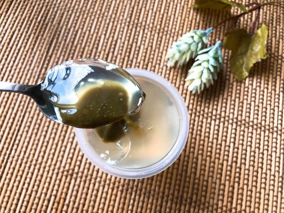 蓋を開けると、わらび餅の中に緑色の丸い何かが入っていますが、これ抹茶餡なんです。
