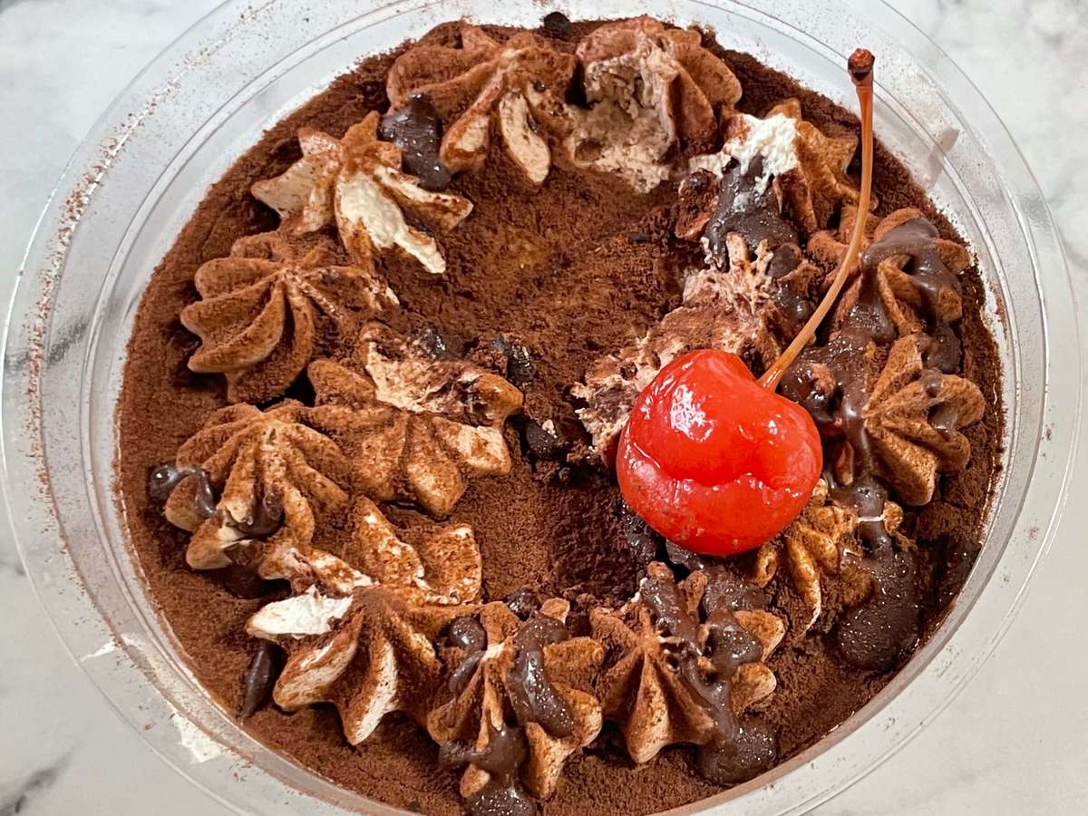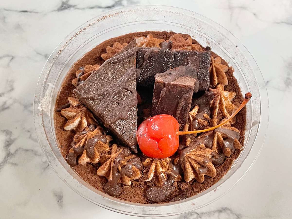 チョコプリン、チョコムース、スポンジ生地を土台に、チョコホイップとホイップクリームと、ガトーショコラ、生チョコ、さくらんぼが盛り付けられたチョコづくしのパフェです。