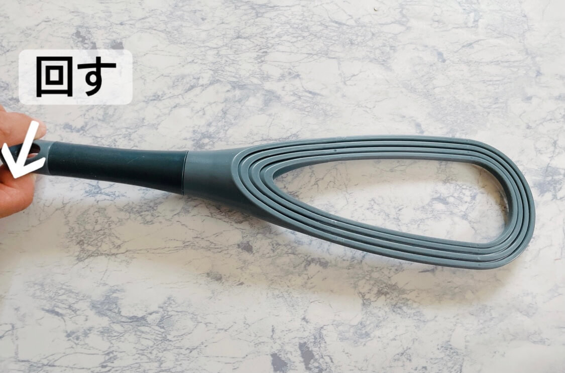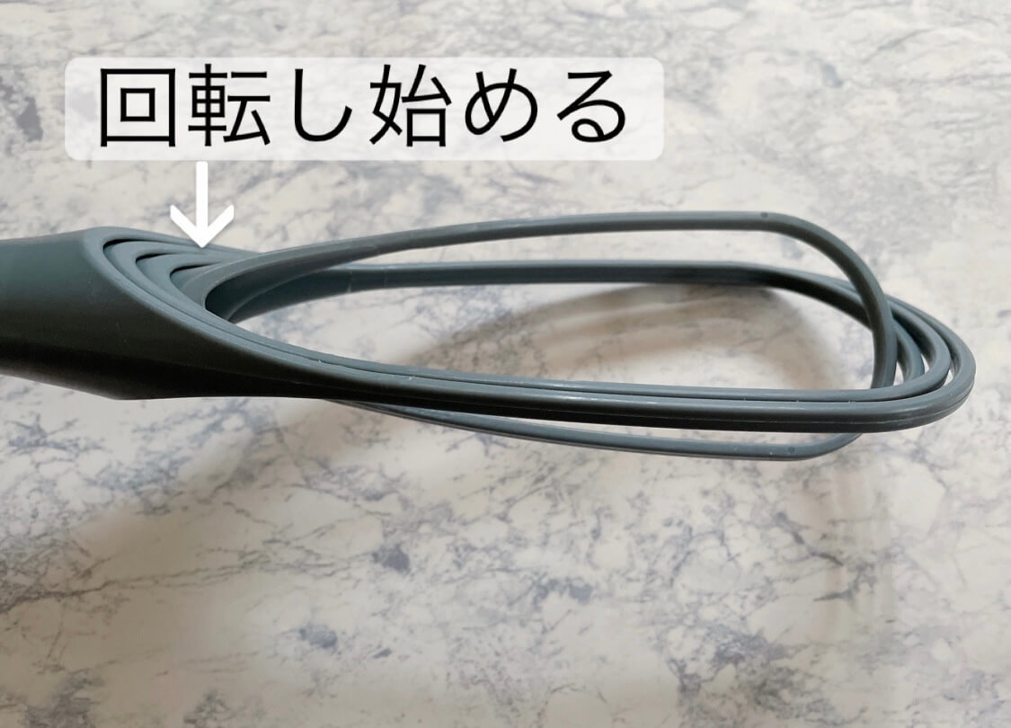 泡立て器というのにこの不思議な形。実はこの形、回すだけで泡立て器にトランスフォームするんです。