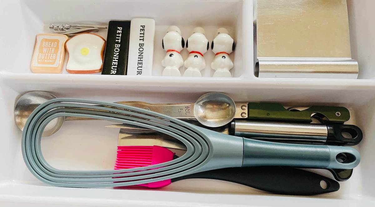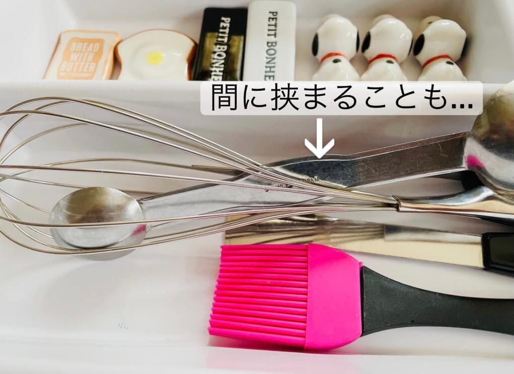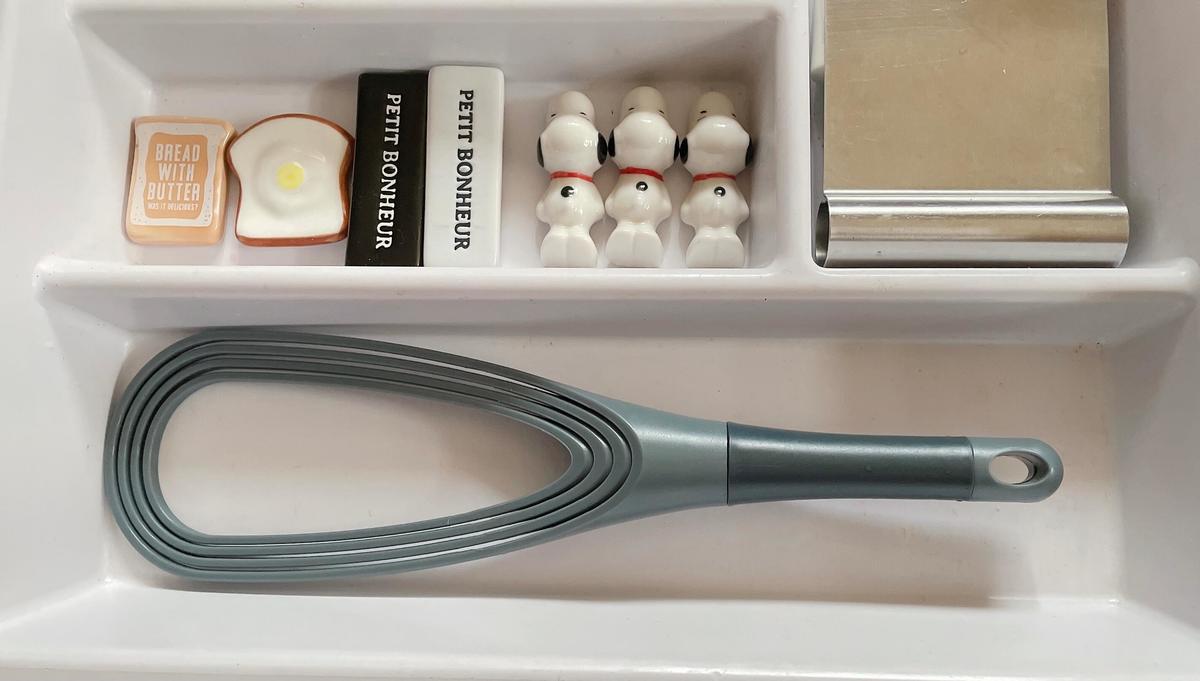 通常の泡立て器だと幅も取りますが、他のキッチンアイテムが挟まったりするので、引き出し収納には向きません。