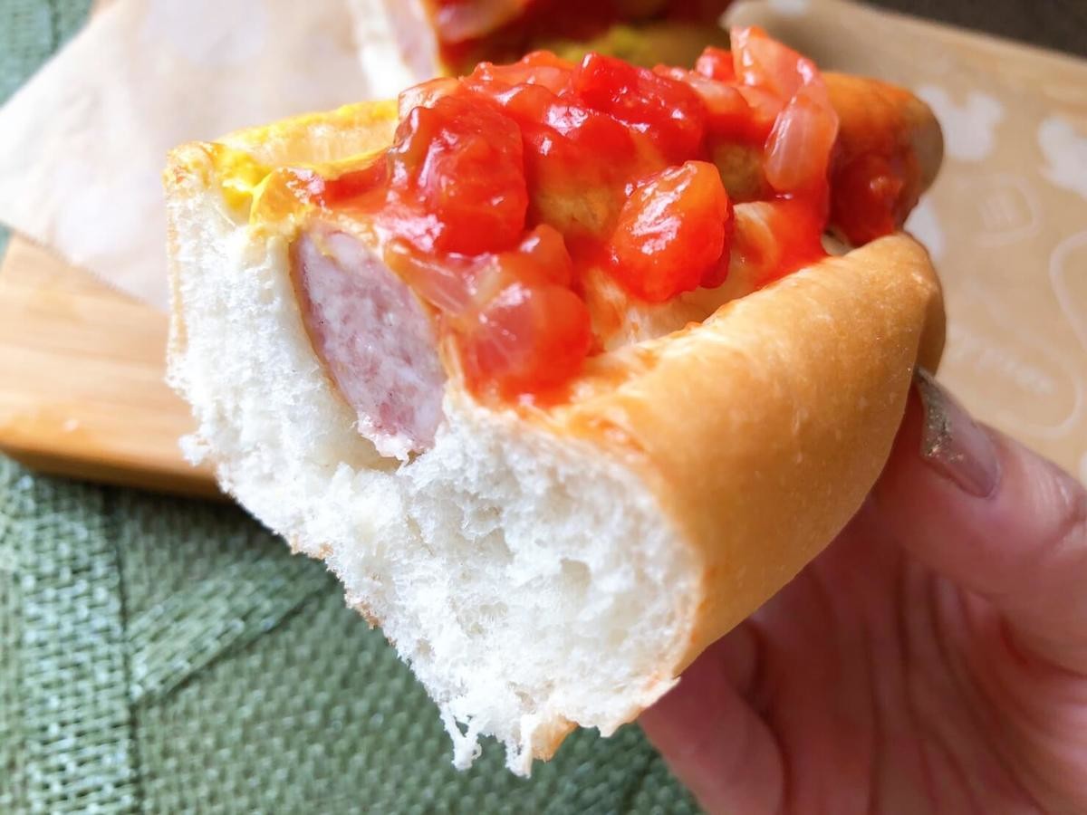 ソーセージの上には細かく刻まれたトマト、玉ねぎ、ハラペーニョがたっぷりのっています。