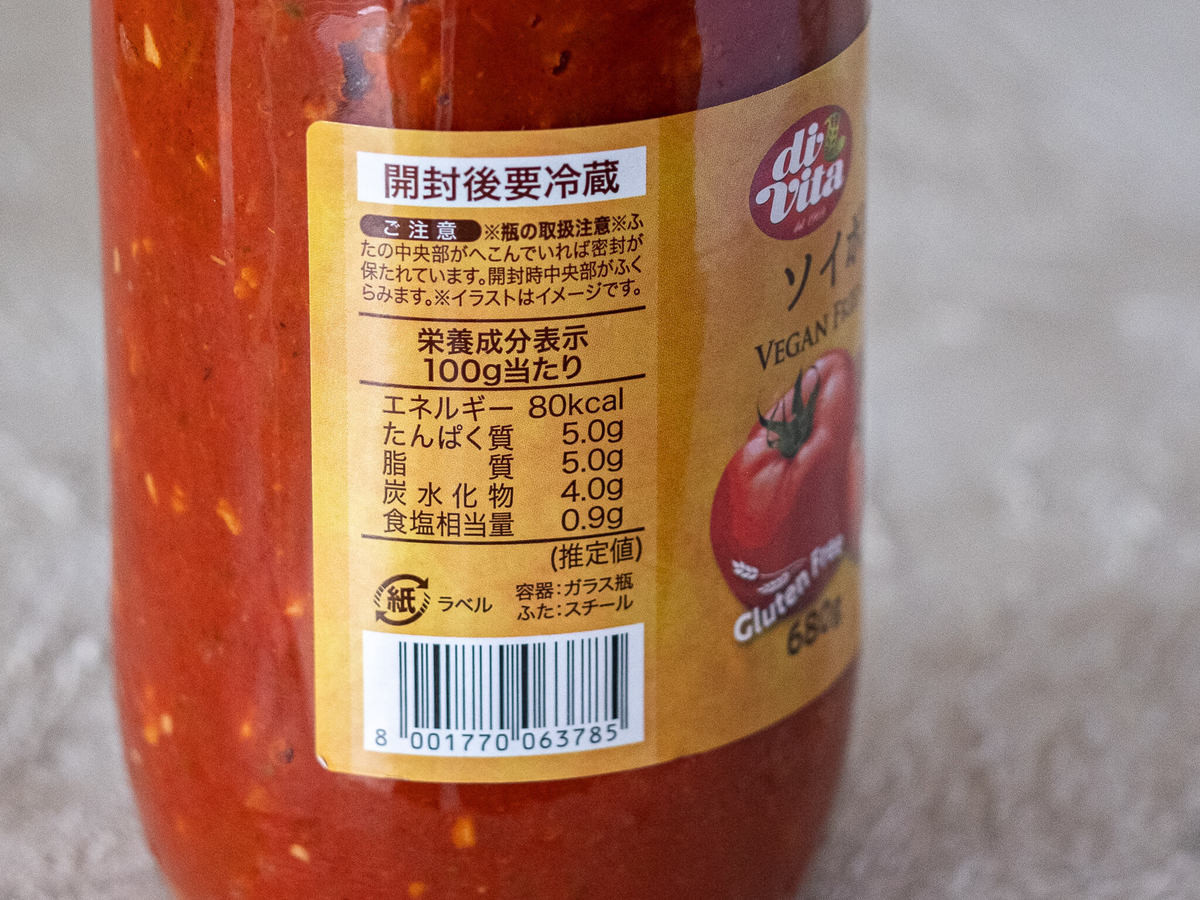 こちらが、業務スーパーで販売されている瓶詰めの「ソイボロネーゼ」ソースです。