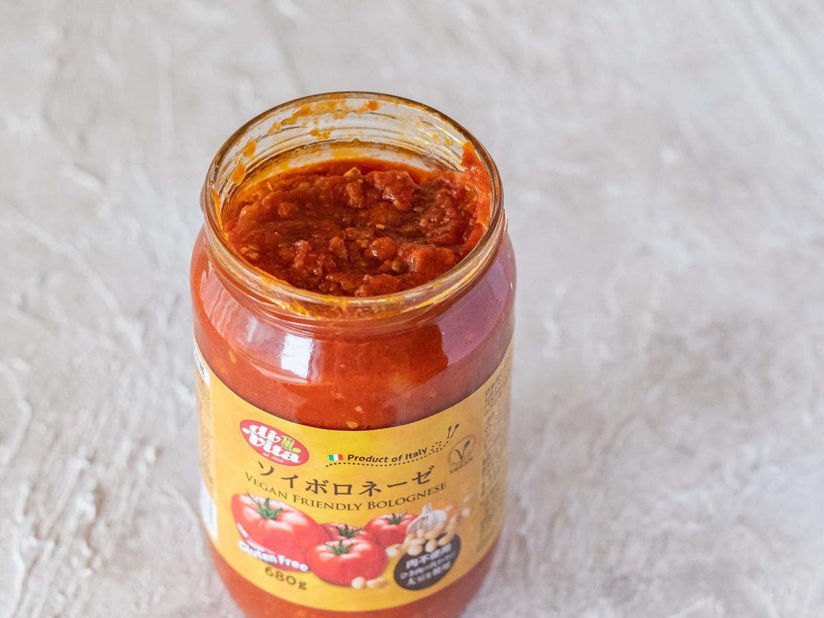 業務スーパーで販売されている瓶詰めの「ソイボロネーゼ」、お値段は1瓶に680gも入って321円(税込)!