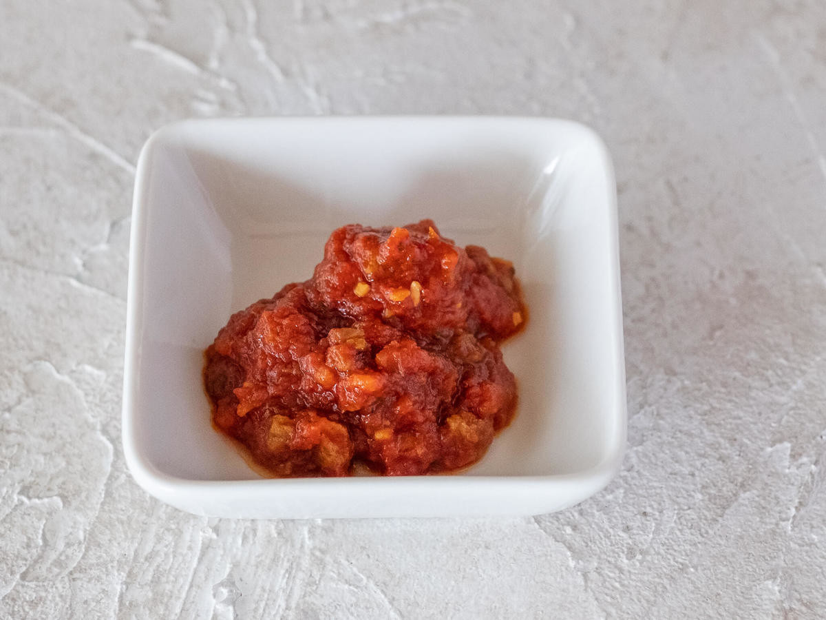 ソースをお皿に出すと、トマトやソイミートの粒しっかりと確認することができます。