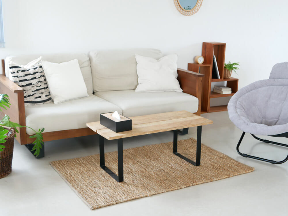 「L」はソファー前のセンターラグとしても◎。 リビングの中央にも堂々と置け、他のインテリアの邪魔をしないのは、この自然素材のマットだからこそ。 ナチュラルでシンプルなデザインは、どんなテイストにもマッチしやすいのが嬉しいですね。
